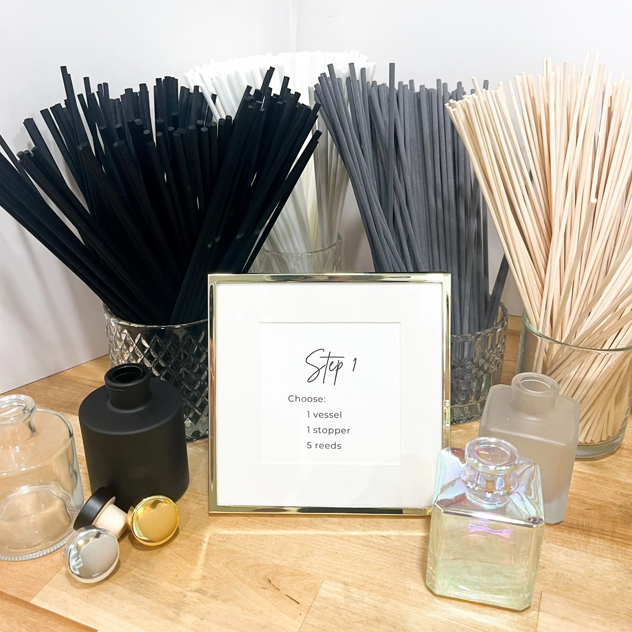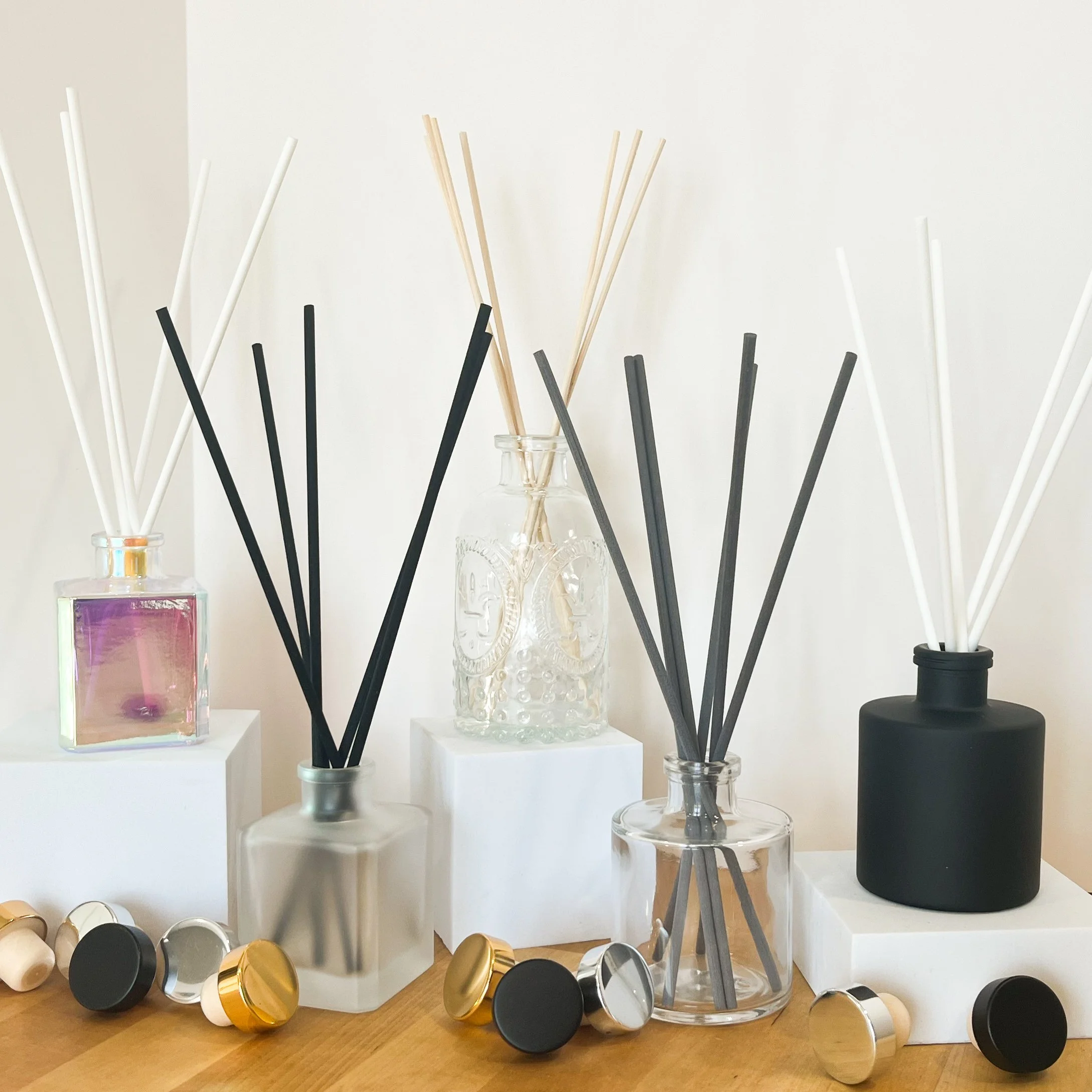Diffuser bottle options + 4 reed colors to help you create a diffuser that fits your home’s aesthetic. From matte black, frosted clear, antique-inspired cut glass + prism-colored glass bottles, the diffuser will fit into any home decor.